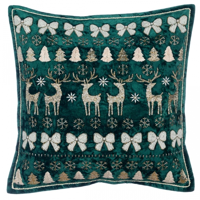 Kissen No1 mit unzähligen unterschiedlichen kleinen Perlen gestickte Motive auf grünem Samtvelours.